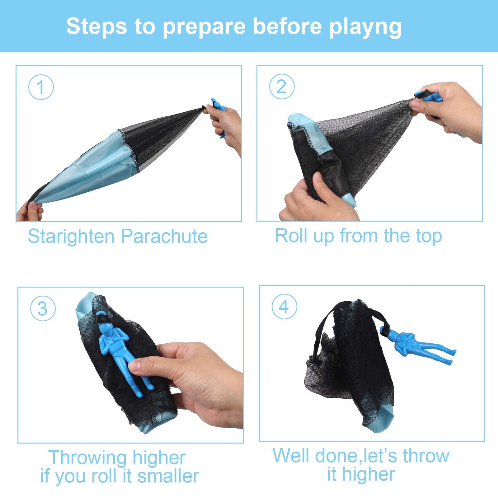 • 【Flugspaß Spielzeug】 Die Fallschirme öffnen sich einwandfrei ohne dass sich irgendetwas verheddert. Bei Wind fliegen die kleinen Fallschirmspringer, mit der richtiger Wurftechnik super. Hinweis:Man kann sie im Wind wehen lassen oder vom Balkon werfen.